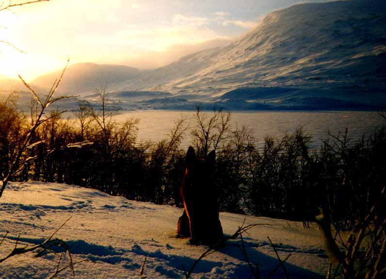 Mer usikker var isen ved Coarvi-sivvun (det lille vannet rett nord for demningen), men såvidt jeg forstår det er visst det rimelig normalt pga utløp fra Balvatnet. Warro datt gjennom isen og fikk seg et høyst ufrivillig bad i litt for mange minus... Heller ham enn meg (dessuten bare rister han seg og går videre som om ingenting hadde skjedd - det hadde ikke jeg gjort!) !!!