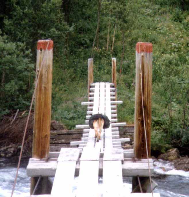 | Skaitidalen, som går fra Trygvebu (BOT) og Skaitigårdene i syd og nord-østover til Balvannet, står for meg som en av de nydeligste og villeste dalene i Salten-området. Denne strekningen fortjener derfor en egen, liten presentasjon. Turen er på ca. 18 km. Fra Skaiti følger vi stien ned mot Skaitielva. Elva bukter seg ned langs dalen og sommerstid går stien langs vestsiden av elva gjennom et meget grønt og frodig område bevokst med bjørkeskog og til tider svært så mye bregner. Om vinteren er det mer naturlig å følge selve elva, som normalt har frosset tilstrekkelig rundt årsskiftet. Vær klar over at dalen har svært bratte sider, og kan være utsatt for ras om vinteren. Etter ca.4-5 kilometer krysser vi elva på hengebru. Tidlig på sommeren kan vannføringen være temmelig kraftig i elva. Vi følger nå elvas østside, og treffer dessverre på et svært reingjerde etter omlag en km. Dette gjerdet er satt opp av svenske reinsamer for å forhindre sammenblanding av norsk og svensk rein.Gjerdet utfyller sikkert sin funksjon, og kanskje er det nødvendig. Allikevel må jeg innrømme at jeg irriterer meg en del over dette gjerdet. Det følger dalen helt ned til Balvannet, og er slettes ikke noe pent syn der det rager ca. 2 meter høyt. | ![]() Warro krysser Skaitielva etter Trygvebu |